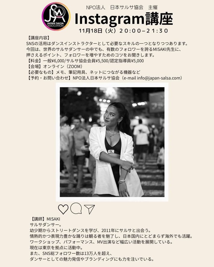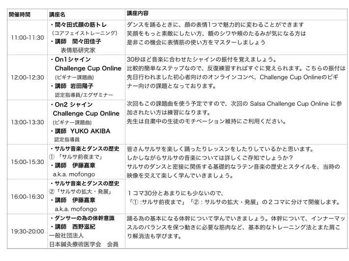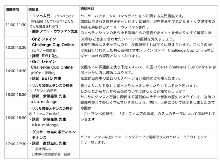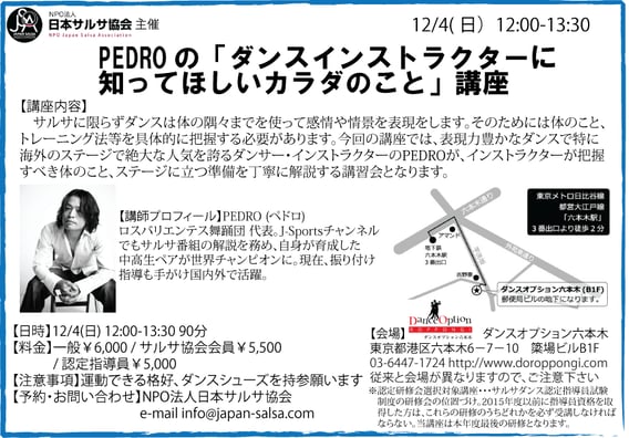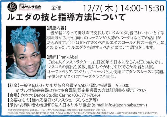 インストラクターの方はもちろん、サルサを楽しむ全ての方に向けた講座となってます。申込み締め切りは 12/1(土)となります。 皆様ふるってご参加ください